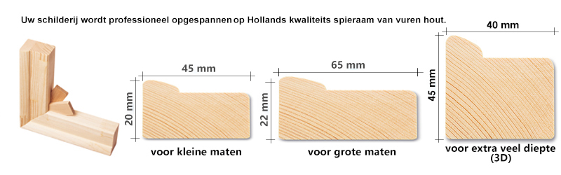 Uw schilderij wordt opgespannen op een Hollands spieraam van vurenhout. U heeft de keuze tussen 2cm of 4cm dikke spielatten.